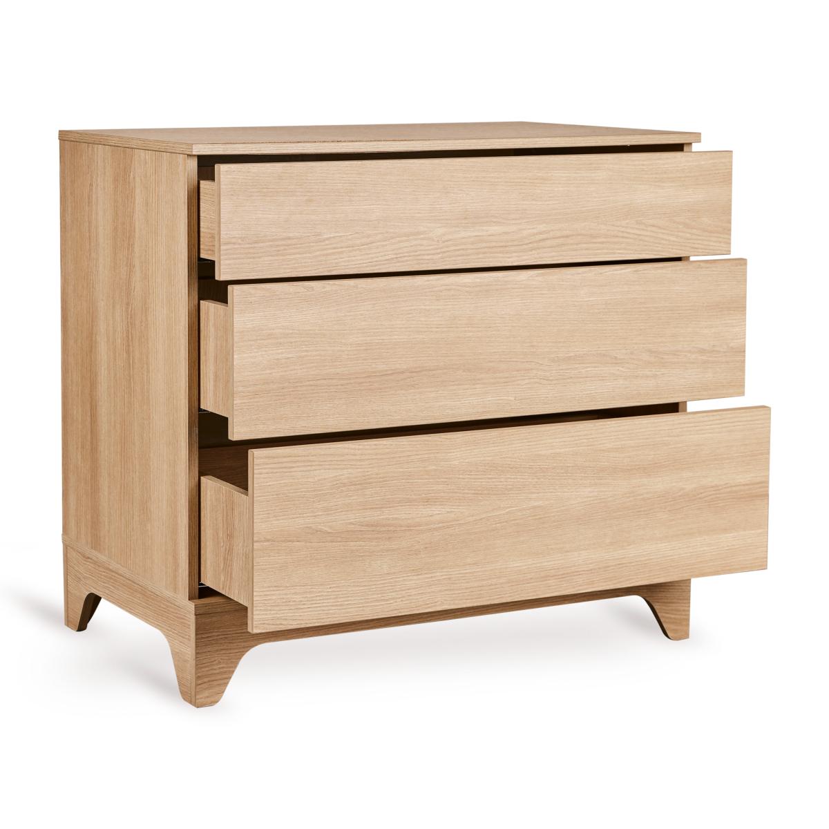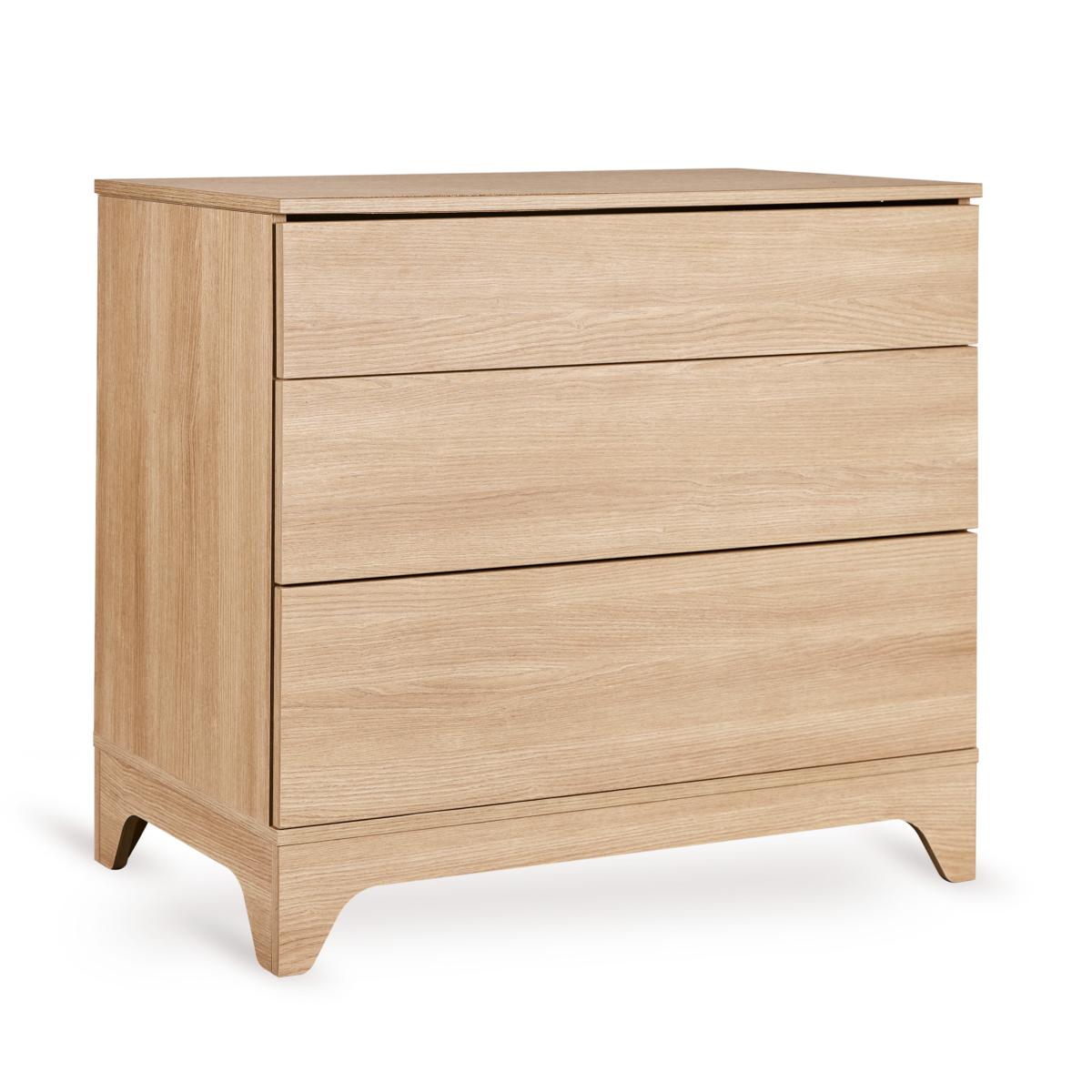 La commode Tsugi associe des lignes douces à un design monochrome et ludique, avec une fonctionnalité pensée pour les parents. Les trois tiroirs sans poignées s’ouvrent en douceur grâce au système push, offrant un bel espace de rangement pour tous les essentiels de soin.