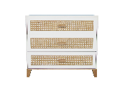 Avec trois grands tiroirs, cette commode vous offre un espace de rangement confortable. Elle dispose de glissières à fermeture douce, ses poignées et ses pieds sont en bois massif apparent (cèdre blanc), et les façades des tiroirs sont en rotin.