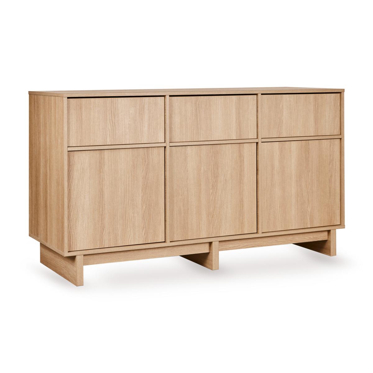 La commode XL Kyo se distingue par sa longueur généreuse de 165 cm, offrant un espace de rangement exceptionnel pour toutes les affaires de bébé et les indispensables du quotidien. Trois tiroirs sans poignées et trois portes à système push garantissent une organisation fluide et intuitive.
