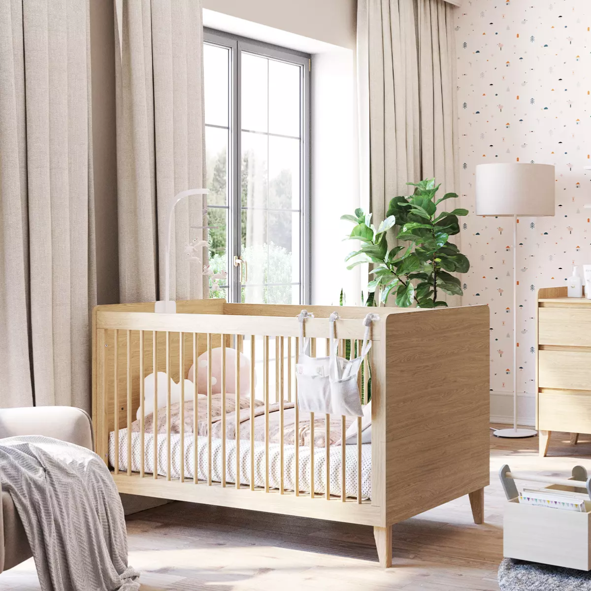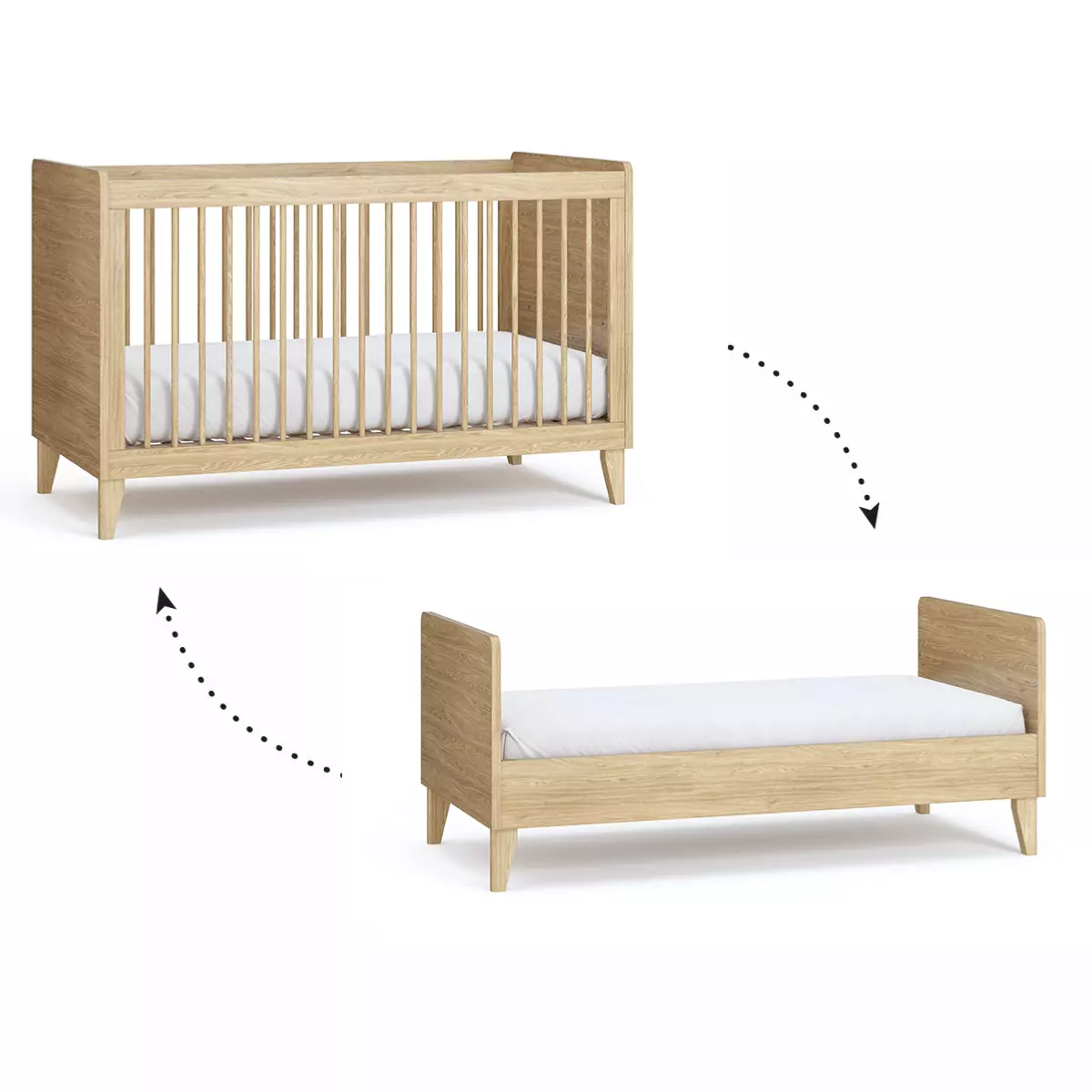 La collection Muve est une combinaison élégante et chaleureuse de couleurs chêne qui crée un espace naturel et harmonieux, idéal pour votre tout-petit, transformable en lit enfant et utilisable de la naissance jusqu'à 7 ans environ.